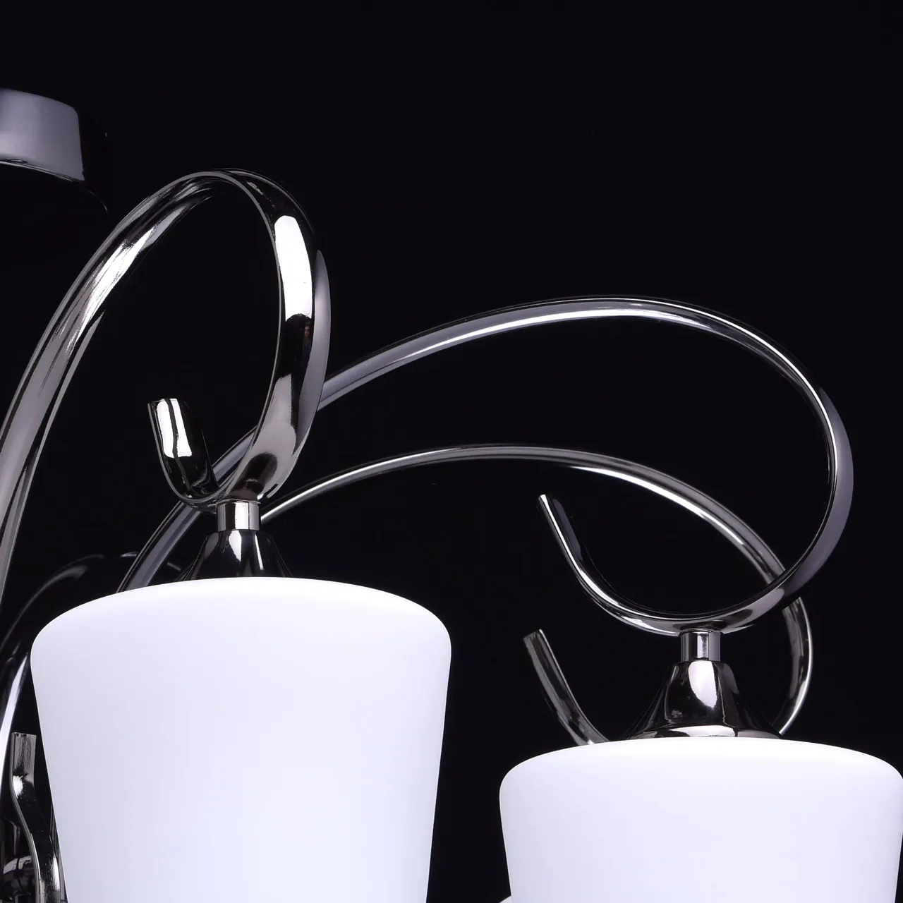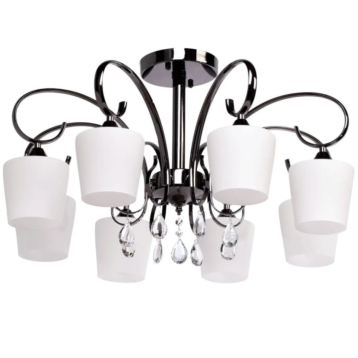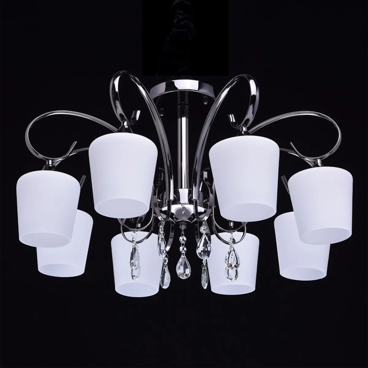 Металлическое основание цвета никеля. Плафоны: стеклянные матированные плафоны. Декор: хрустальные