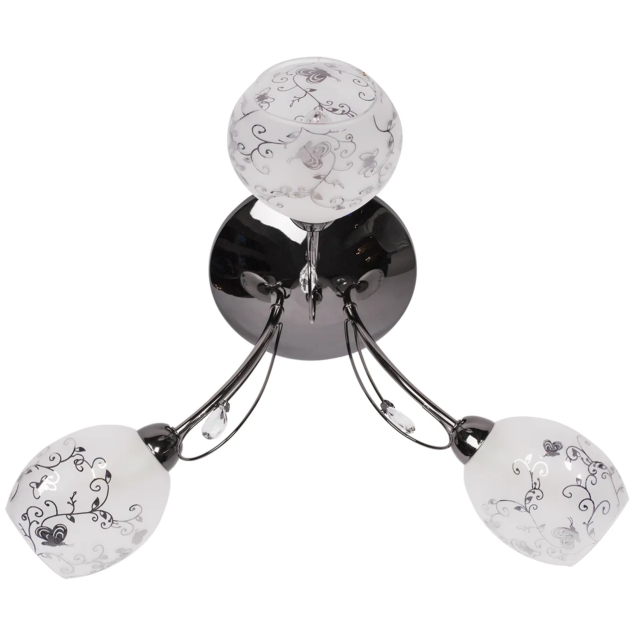 Металлическое основание цвета никеля, плафоны из матового стекла с гальванизированным рисунком, деко